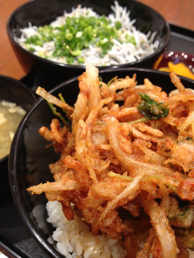 お昼ご飯はしらす丼と桜海老のかきあげを半分こする( ´ ▽ ` )ノ