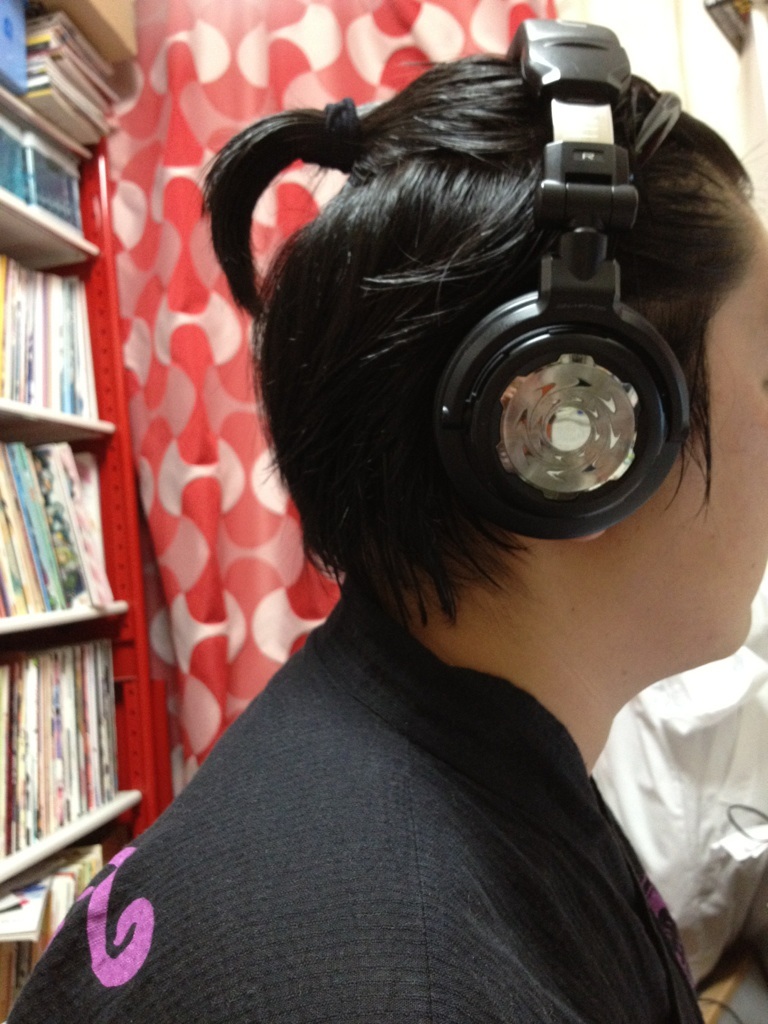 ヘッドフォンに、ちょんまげに、ヘアバンドに作務衣(笑)