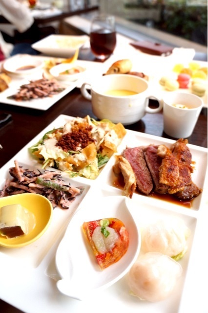 竹芝のいんたーこんちねんたるホテルのビュッフェに連れてきてくれたー。サラダと肉とケーキウマウマ